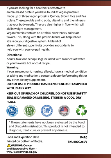 Mezcle 1 cucharada en 8-10 oz de agua fría o leche de almendras sin azúcar. Agite bien durante 30 segundos, deje reposar durante 40 segundos y vuelva a agitar antes de beber. Ajuste su ingesta de proteínas de 1 a 4 porciones por día, según su objetivo físico y sus necesidades de proteínas.